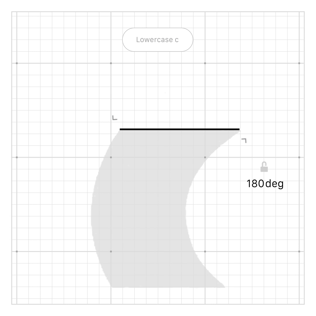 (EN) We developed a recipe and then danced between modifying the established components in an iterative cycle of “transform” actions like reflection and mirroring. We also adjusted the points per glyph to fit the expected construction. We also increased the x-height of the lowercase letters and opened up the counters for better legibility. (Fig 12. a mirrored to e) (Fig 13. Adding straight stem to c to form d)